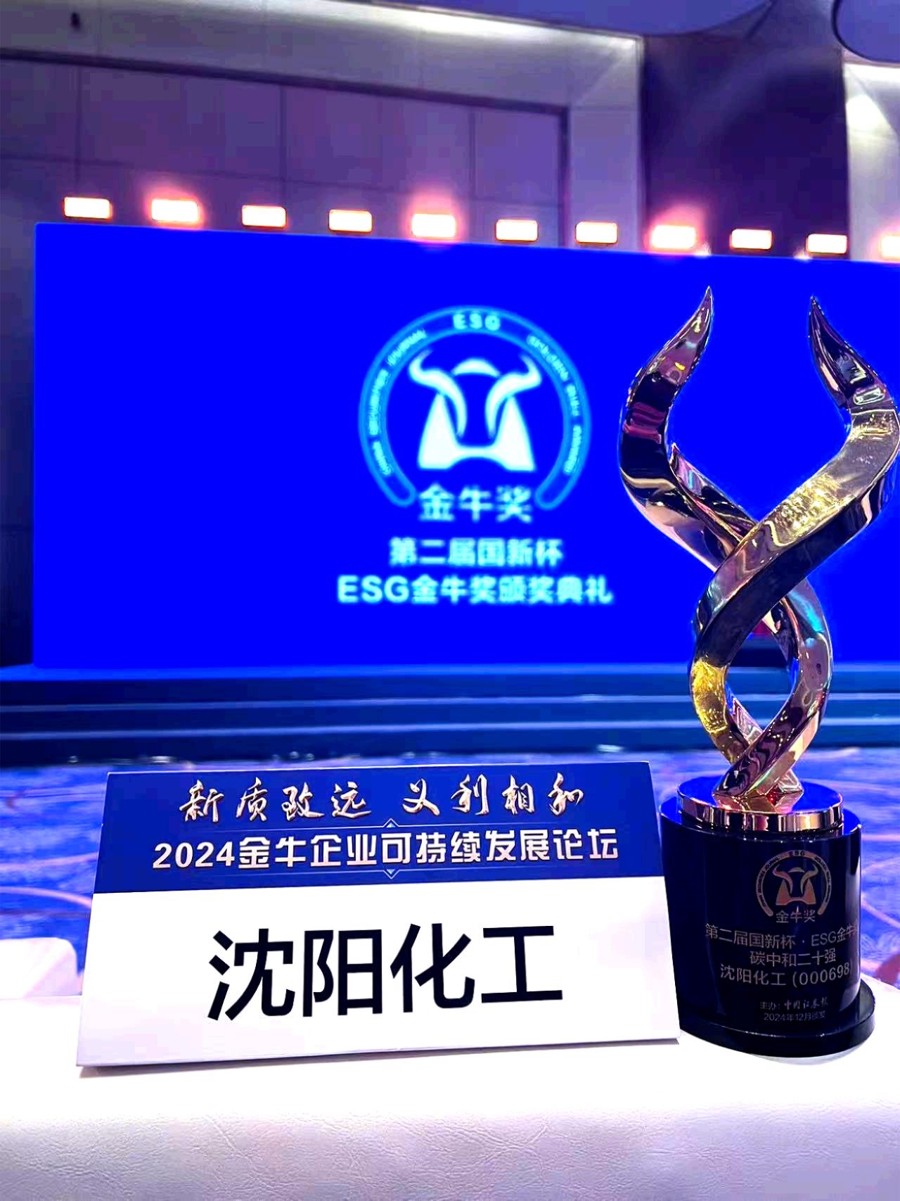 12月6日,由《中國證券報》攜手中國國新控股有限責(zé)任公司旗下國新咨詢有限責(zé)任公司聯(lián)合舉辦的“新質(zhì)致遠(yuǎn) 義利相和——2024金牛企業(yè)可持續(xù)發(fā)展論壇”暨“第二屆國新杯·ESG金牛獎頒獎典禮”在上海圓滿落幕,沈陽化工股份有限公司(以下簡稱“沈陽化工”)在此次頒獎典禮上榮獲“國新杯·ESG金牛獎碳中和二十強(qiáng)”獎項。這是公司繼去年獲得“第一屆國新杯·ESG金牛獎碳中和五十強(qiáng)”獎項后,再次獲得的ESG殊榮。